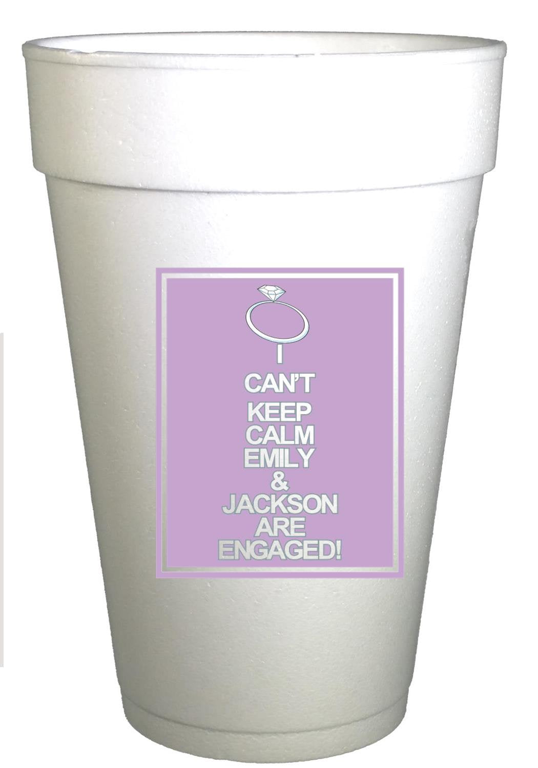 These personalized engagement cups from Preppy Cups by Preppy Mama are the perfect addition to your engagement celebration cups collection, designed to bring style and fun to your special event. Each 16 oz. personalized styrofoam cup features a charming Keep Calm design, crafted to enhance your party atmosphere while keeping drinks cold and hands dry. Ideal for engagement party cups, bridal shower cups, and wedding party cups, these custom party cups combine practicality with a preppy flair that guests will love.