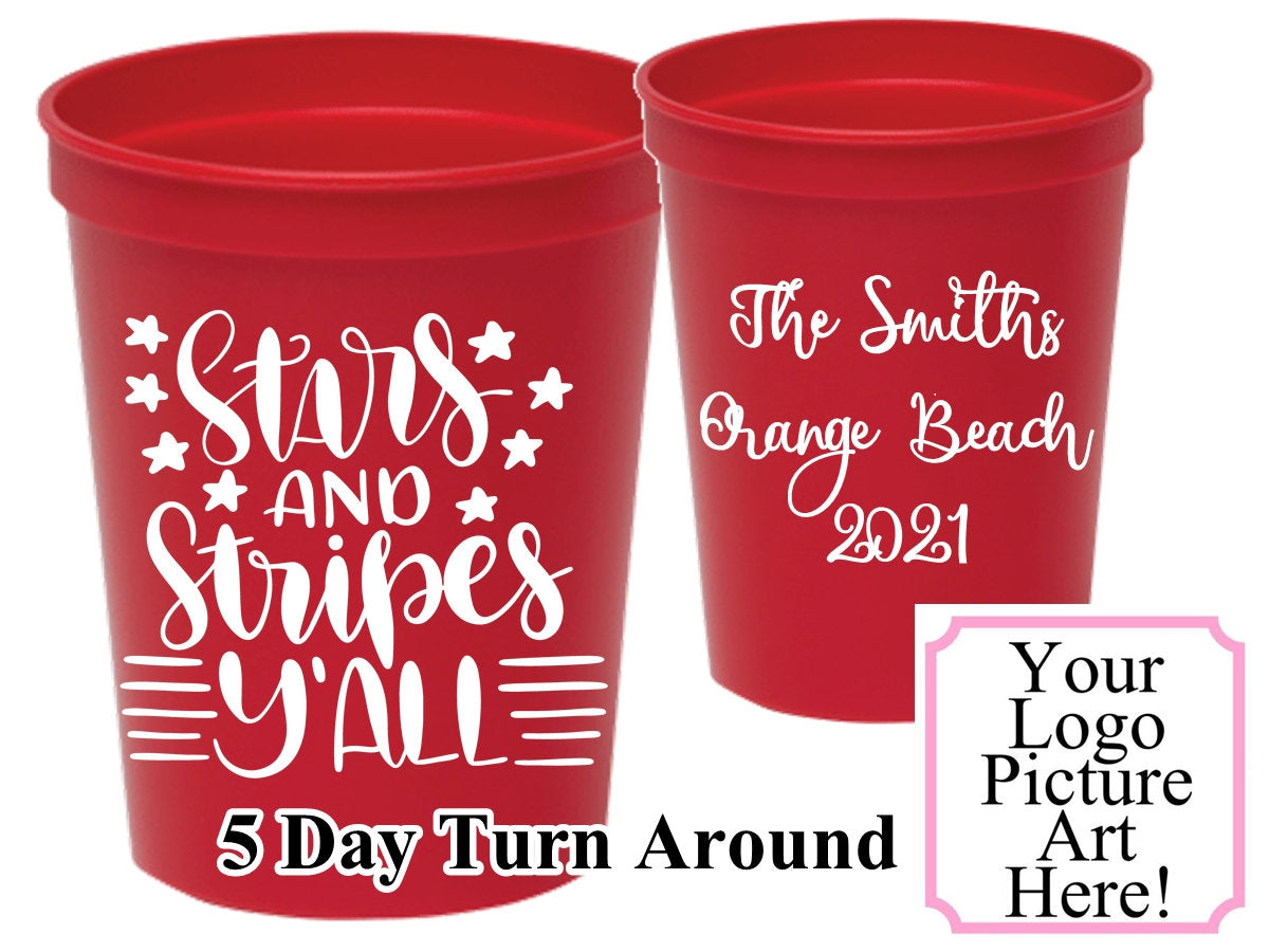This personalized stadium cup is a 16oz stadium cup designed to elevate your Fourth of July celebrations with custom party cups that showcase your unique style. Crafted from durable plastic cups, these colorful stadium cups offer vibrant patriotic drinkware perfect for any festive occasion. Whether you need custom wedding cups, graduation party cups, or personalized party favors, these one-color personalized stadium cups deliver both quality and flair.
